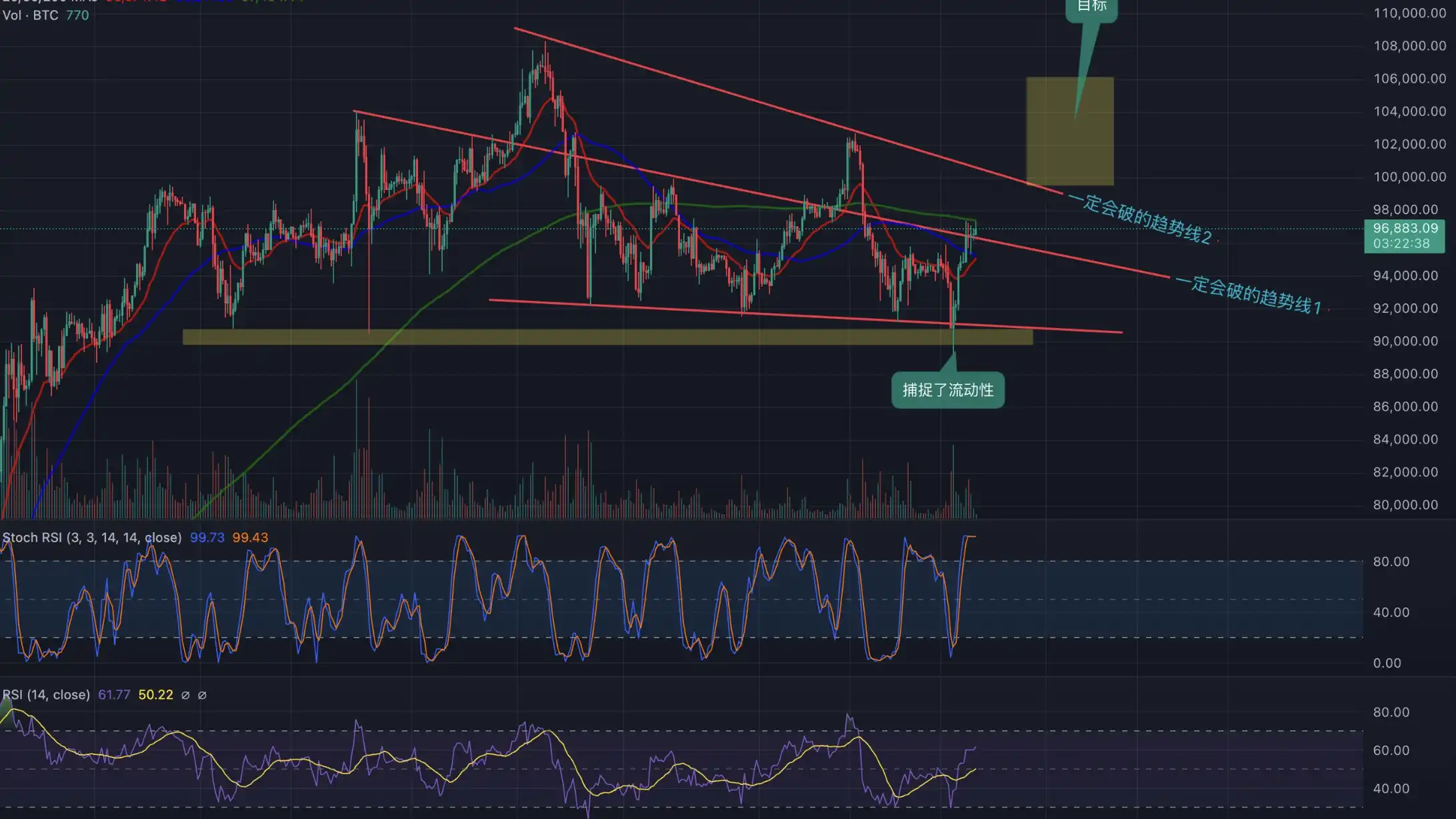 BTC 突破了**条趋势线,期待突破第二条。短期在等均线跟上价格,休息一下继续涨。