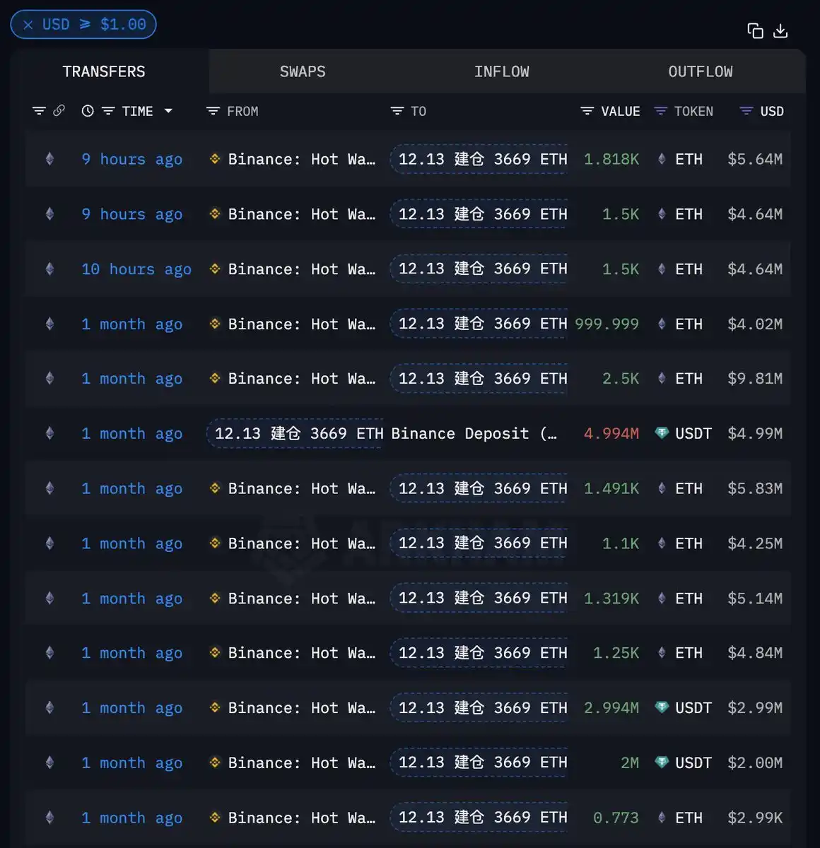 时隔一个月,「12.13 建仓 3669 ETH 新地址」在周一暴跌时再次加仓 4817 枚 ETH,价值 1492 万美金;2024.12.05 以来该地址已累计建仓 13,479 ETH,总价值 4278 万美金,成本 $3622,目前已浮亏 590 万美金
