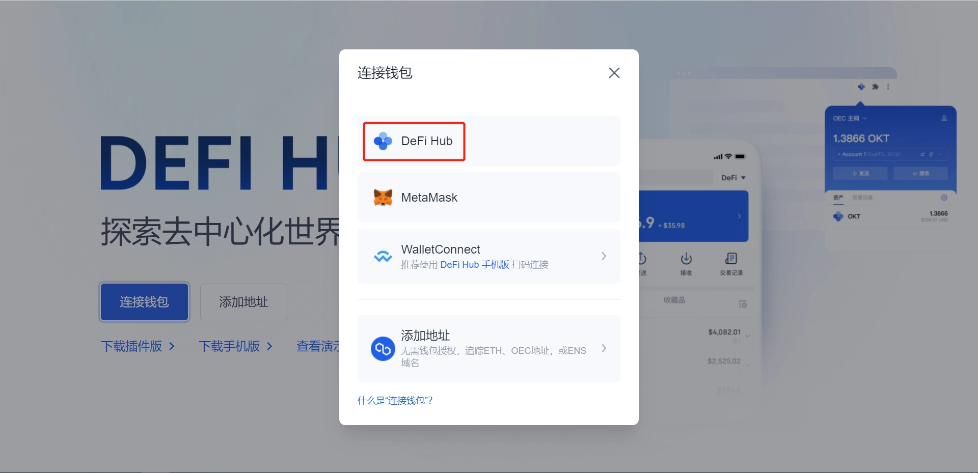 你可以在欧意首页左上角,点击【DeFi】进入【DeFi Hub】,点击【连接钱包】,选择【DeFi Hub】。