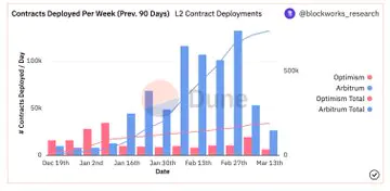 从开发者部署情况来看,如下图的DUNE数据显示,过去90天内在Arbitrum上部署的合约数量在50k-100k之间,而OP部署的合约数量在10-30k左右,长期来看,更多开发者的入驻对Arbitrum是更为有利的。
