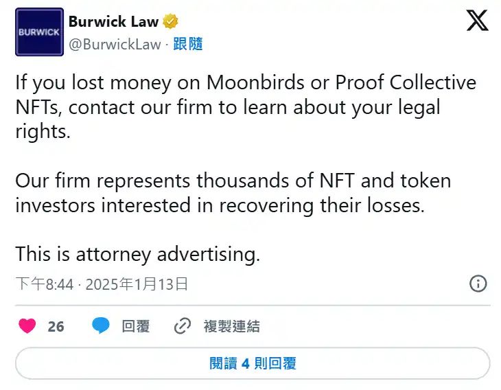 Burwick Law 特别声明,律所与**使用其名称或形象的**无关,并强调其致力于推动加密产业的问责机制。除了 Pump.fun 案件外,律所也针对其他涉及诈欺的 NFT 和区块链项目提起法律诉讼,包括 Moonbirds 和 Proof Collective NFT,以及 Full Send Metacard NFT。