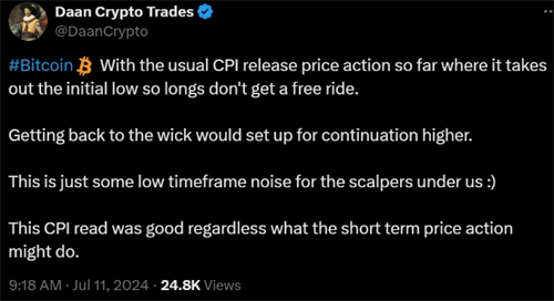 7月12日**消息,2024年6月,美国公布的消费者价格指数(CPI)同比上涨3%,略低于市场预期的3.1%,这一数据引发了市场关于美联储降息预期的讨论。然而,尽管宏观经济环境看似对加密货币市场有利,比特币(BTC)的价格却仍然徘徊在5.75万美元左右,未能突破6万美元的关口。分析师和交易员们对此给出了多种解释,其中三大因素尤为关键。