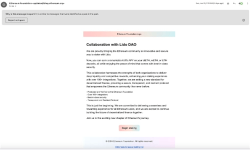 这些精心设计的钓鱼邮件中,包含了一条极具诱惑力的虚假公告,声称以太坊基金会已与知名的Lido去**化自治组织(LidoDAO)携手,为质押的以太币(stETH)、包装以太币(WETH)或以太币(ETH,当时价格约为$3,415)提供高达6.8%的年化收益率。公告还强调,整个质押过程将受到以太坊基金会的严格保护和验证,以此诱骗用户上钩。