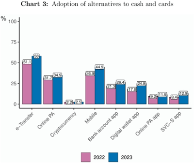报告显示,尽管过去十年见证了支付方式的多元化发展,电子转账等新兴方式逐渐获得加拿大民众的青睐,成为仅次于现金和银行卡的重要支付手段,但加密货币在该国的接受度依然有限。2022年,**2.2%的受访者表示曾使用加密货币进行支付,而到了2023年,这一比例仅微增至2.5%。