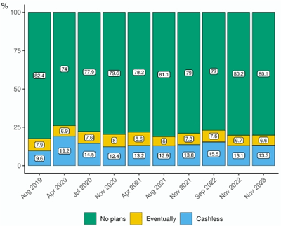 加拿大人对无现金未来的抵触情绪是加密货币普及**的主要原因之一。调查结果显示,超过80%的受访者表示他们没有计划在未来放弃使用现金,这一趋势自2019年以来一直保持稳定。这种对传统支付方式的坚守,反映了加拿大人对于货币形态变化的谨慎态度。