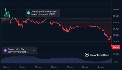 近期,加密货币市场经历了一次剧烈的震荡,原因是有消息透露德国政府计划出售大量比特币。德国联邦刑事警察局持有的约50,000个比特币,这些比特币是在2013年从一家盗版网站查获的,目前总价值已超过30亿美元。市场对此消息反应强烈,比特币价格从66,000美元跌至63,000美元。据报道,德国当局已开始出售部分比特币,但仍有大量比特币待售,这引发了投资者的广泛担忧。