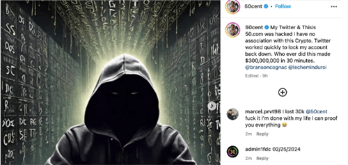 50 Cent通过其拥有3280万粉丝的Instagram账户发布声明,确认了他的X账户和官网遭到黑客攻击,并指出已有大量资金从相关项目中流失。他透露:“Twitter迅速锁定了我的账户。不管是谁做的,他在30分钟内就赚了3亿美元。”同时,他强调自己“与这种加密货币没有**关系”。