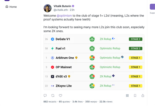 以太坊的联合创始人Vitalik Buterin承认了这一里程碑,并欢迎Optimi**加入“阶段1 L2s俱乐部”。尽管如此,这位联合创始人仍然需要更多基于零知识证明的第二层平台来加入这个行列。