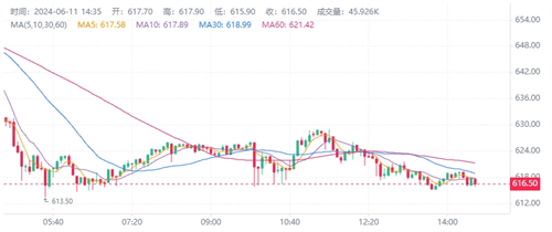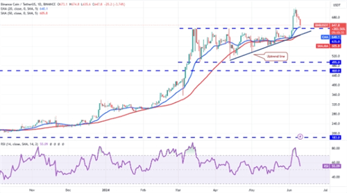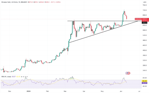 BNB的价格从6月6日的722高点回落,于6月10日触及635的突破点。这一价位是市场关注的焦点,因为多头和空头将在此位置展开激烈的争夺,以决定市场的下一步走向。