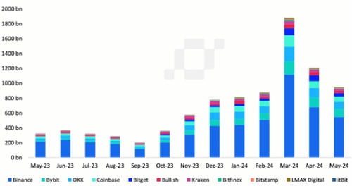 根据CCData的数据,5月份币安的市场份额下跌了17.3%,至1.68万亿美元,这是连续第二个月的下跌。CoinGecko的数据也证实了这一点,币安加密货币交易所的每日交易量从3月15日的610.5亿美元下降到6月10日的100亿美元,降幅超过83%。