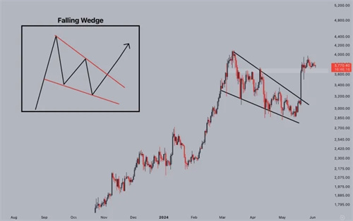 由于现货ETH ETF获得批准,以太坊打破了持续数月的楔形下跌模式。当时,ETH成功恢复了3600美元的价格区间,并短暂测试了3900美元的价格区间。