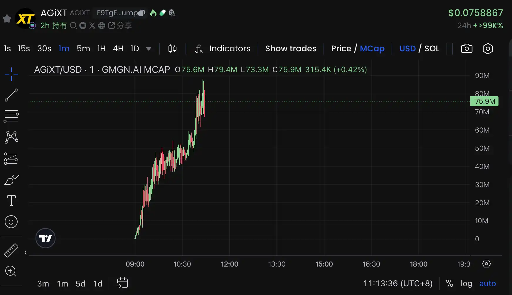 今天上午 9 点,一个名为 $AGIXT 的新 AI Agent **出现,在不到短短 2 小时的时间里市值迅速来到 8000 万美金;而更夸张的是,这期间**的交易量达到了 9600 万,展现出久违的市场活跃度。