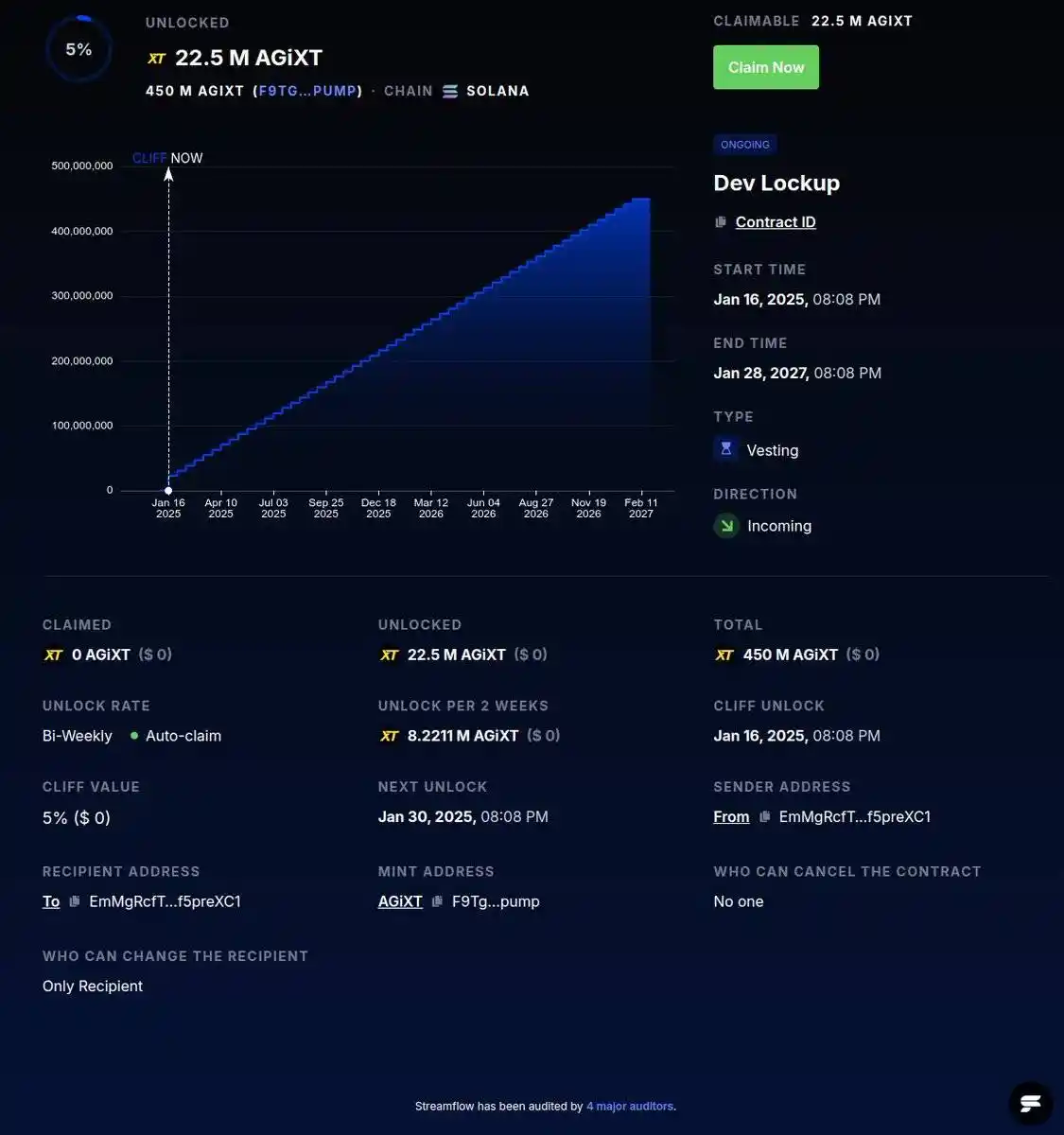 公开数据显示,他正在使用 Streamflow Finance 锁仓,将总量 450M 的 AGIXT **中的 5%(约 22.5M 个**)进行为期两年的线性释放,从 2025 年 1 月 16 日开始,每两周自动解锁一次,直至 2027 年 1 月 28 日结束。