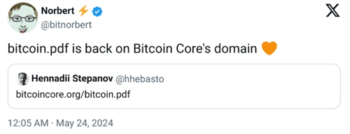 Bitcoin.org网站的维护者亨纳迪·斯捷潘诺夫(Hennadii Stepanov)在X平台上分享了**PDF的链接,宣布比特币**的回归。