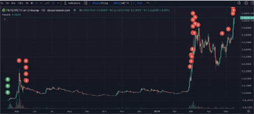 与此同时,GameStop股票的上涨也可能对PEPE币的飙升起到了推动作用。据报道,在Keith Gill重返社交媒体并引发GameStop股价飙升后的第二天,PEPE币就创下了历史新高。这不禁让人联想到2021年GameStop股票热潮与加密货币市场的紧密联系。