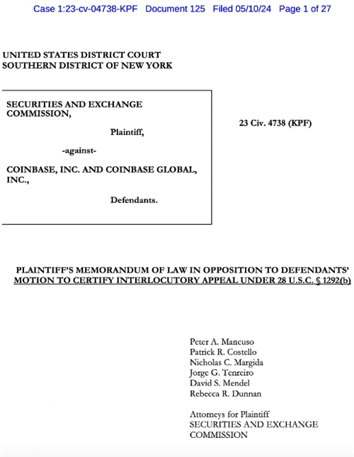 5月12日**消息美国证券交易委员会(SEC)近日针对加密货币交易所Coinbase的中间上诉请求提出反驳,指出Coinbase试图通过操纵对关键问题的解释来影响正在进行的诉讼。SEC在5月10日向纽约南区地方法院提交的文件中表示,Coinbase的做法是“弄巧成拙”的。