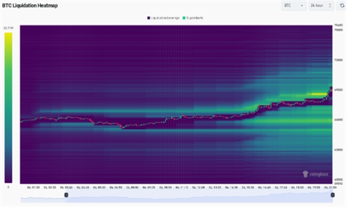随着比特币价格的上涨,那些做空BTC的投资者可能面临风险。据监控资源CoinGlass的数据显示,当BTC/美元突破68,620美元时,有3270万美元的流动性被解锁。这进一步加剧了市场的波动性,使得空头投资者面临更大的压力。