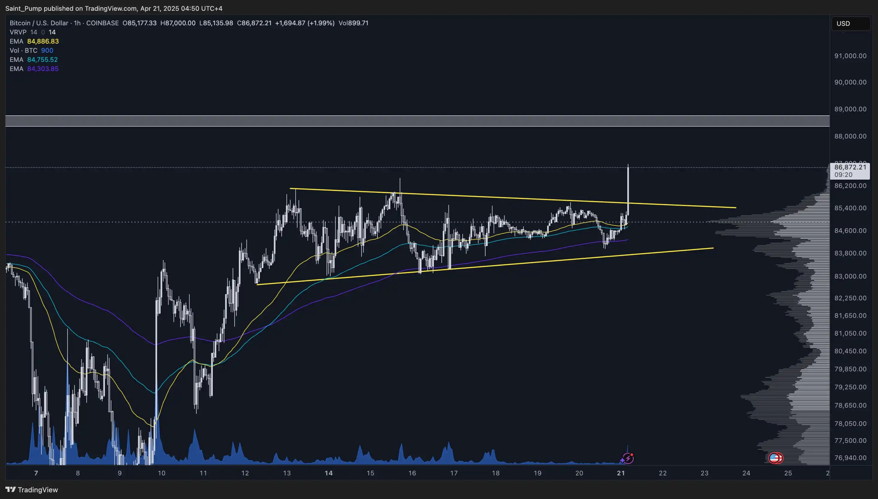 交易员 Saint Pump 发布推文称,比特币空头在这次上扬中被挤压,现在目光焦点是 8.8 万美元。