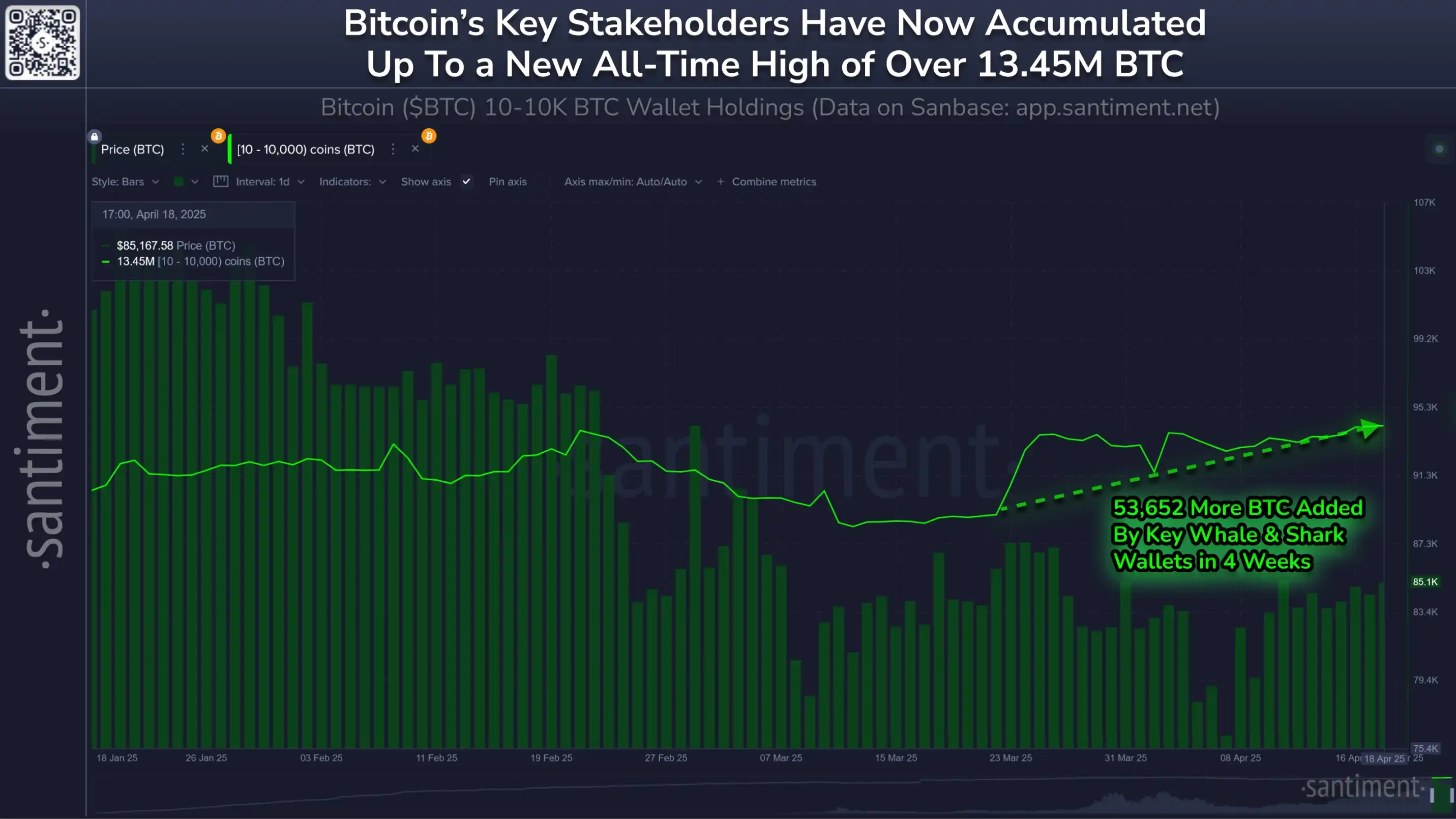 Santiment 发布的数据图显示,持有 10 枚至 1 万枚比特币的钱包作为比特币的关键利益相关方,目前持有这一市值居于加密货币市场之首的资产的 67.77%。在 4 月的市场波动期间,这些钱包持续增持,自 3 月 22 日以来已累计买入超过 5.36 万枚比特币。