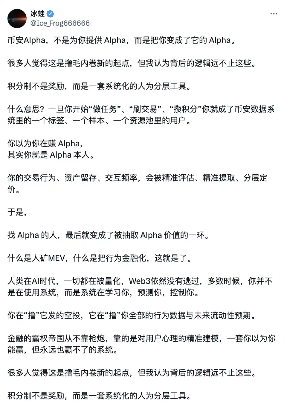 这轮周期是撸毛人被反撸的一个周期,大部分颗粒无收的撸毛工作室早已关门,大部分撸毛 KOL 也转型到了其他赛道,比如冰蛙这样的老撸毛 KOL,就转型成了「项目维权博主」。