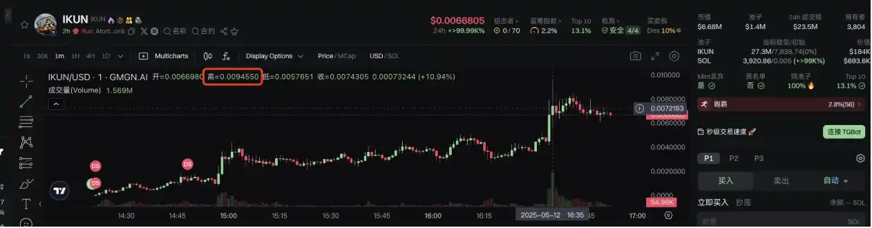 IKUN,以明星蔡徐坤的粉丝群体名称为 Meme 的代表性项目,因 Letsbonk.fun 平台知名大 V @theunipcs(Bonkguy)在中文社区博主及社区成员的宣传(CX)下而获得海内外 Meme 币社区的关注。据 GMGN 平台信息,IKUN **信息如下: