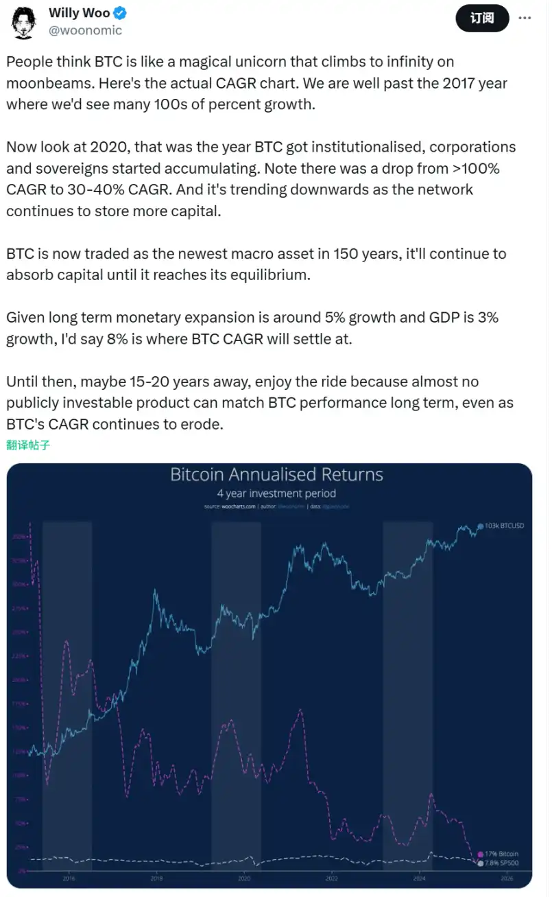 Willy Woo:比特币当前仍具上涨空间,预计 15 至 20 年后复合年增长率或稳定在 8%
