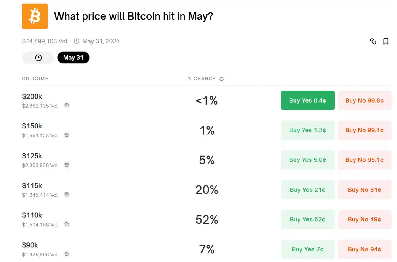 该预测市场还预测比特币 5 月超过 11.5 万美元的概率也升至 20%,表明市场看涨动力强劲。目前该预测市场的总成交额约 1500 万美元。