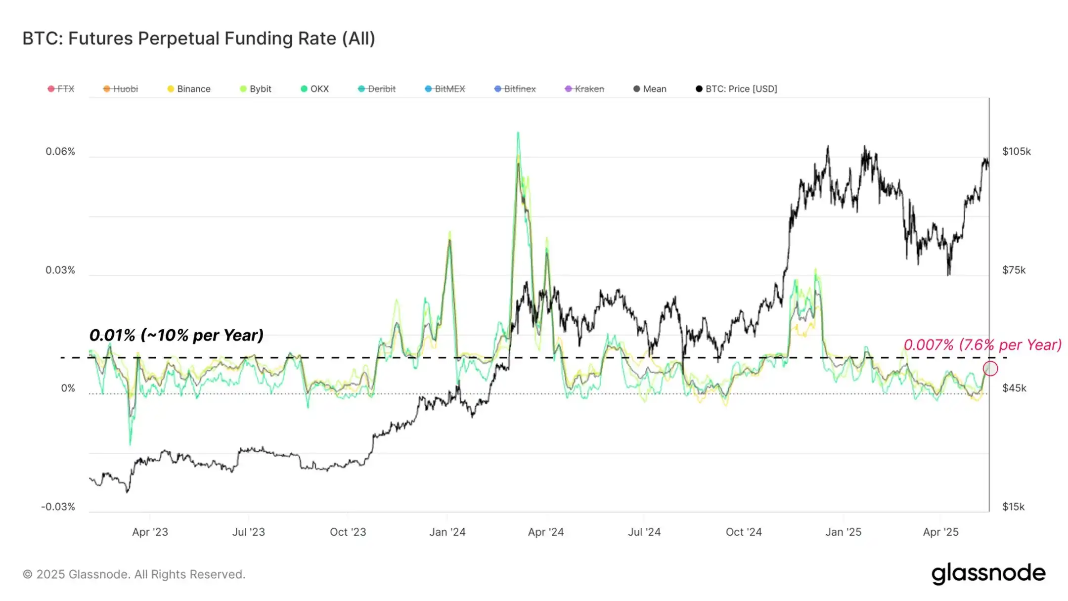 glassnode 发推表示,尽管 BTC 价格大幅上涨,但永续期货的资金费率仍保持在约 0.007% 的中性水平——这表明多头头寸仍然较为温和。衍生品市场似乎正在追赶现货市场,有限的杠杆率暗示着健康且可持续的趋势。