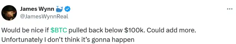 交易员 James Wynn 发推表示,如果 BTC 能回调到 10 万美元以下就好了,那我就能再加仓了。可惜我觉得这可能不会发生。