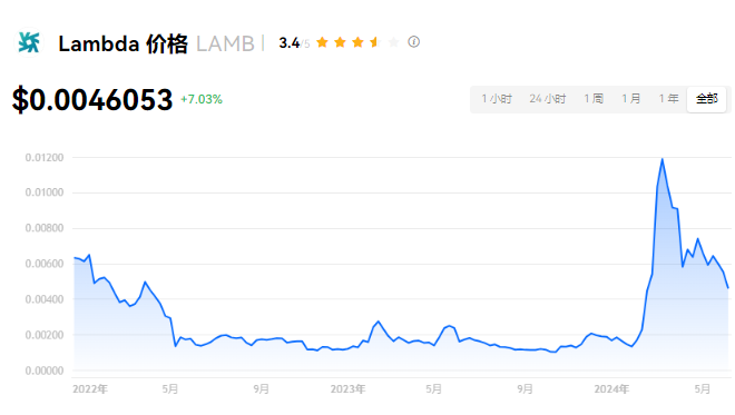 Lambda当前价格为$0.0046053。Lambda的价格在过去24小时内上涨了 7.04%。目前,Lambda市值排名为第260名,实时市值为$856.67万,流通供应量为1,861,111,097 LAMB,**供应量为6,000,000,000 LAMB。我们会实时更新Lambda/USD的价格。
