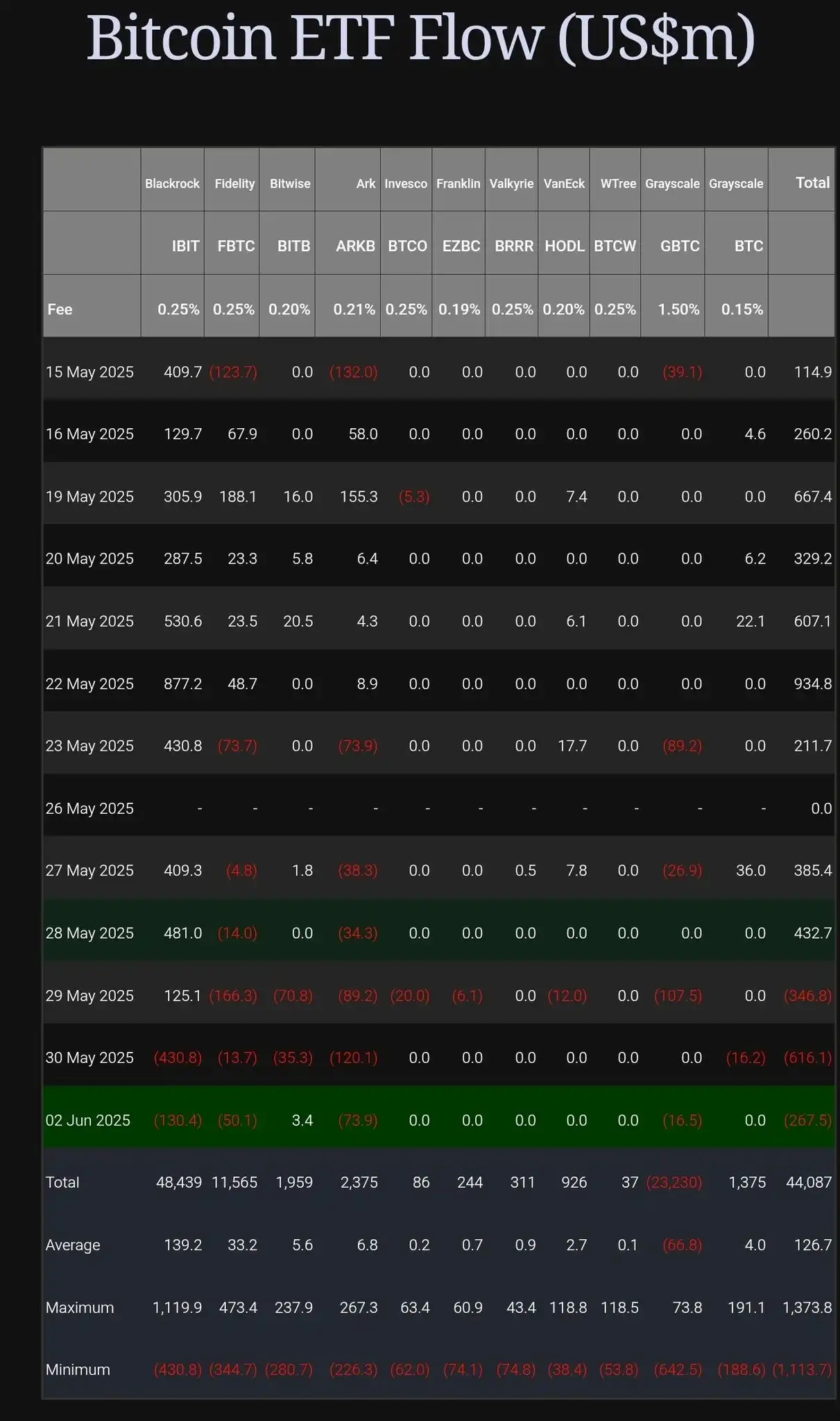 6 月 2 日,比特币现货 ETF 出现 净流出 2.675 亿美元,而且这已经是连续第三天出现大额资金撤离。这不是偶发现象——这种趋势已经持续了几个月,说明机构正在迅速撤退。