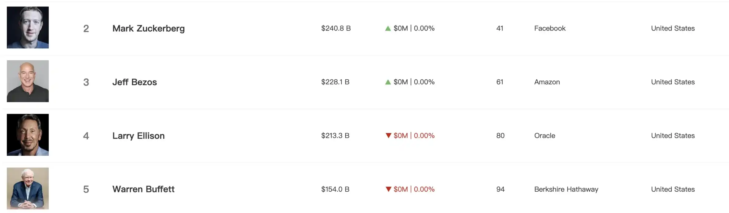 尽管如此,得益于之前的财富积累,根据福布斯实时亿万富翁排行榜信息,马斯克目前仍以 3938 亿美元的身家高居排行榜**,世界首富仍然实至名归,远超第二名的 Meta 创始人扎克伯格(身家 2408 亿美元)、第三名的亚马逊创始人杰夫·贝索斯(身家 2281 亿美元)以及第四名的甲骨文创始人拉里·埃里森,甚至是「股神」沃伦·巴菲特身家(价值 1540 亿美元)的近 3 倍。