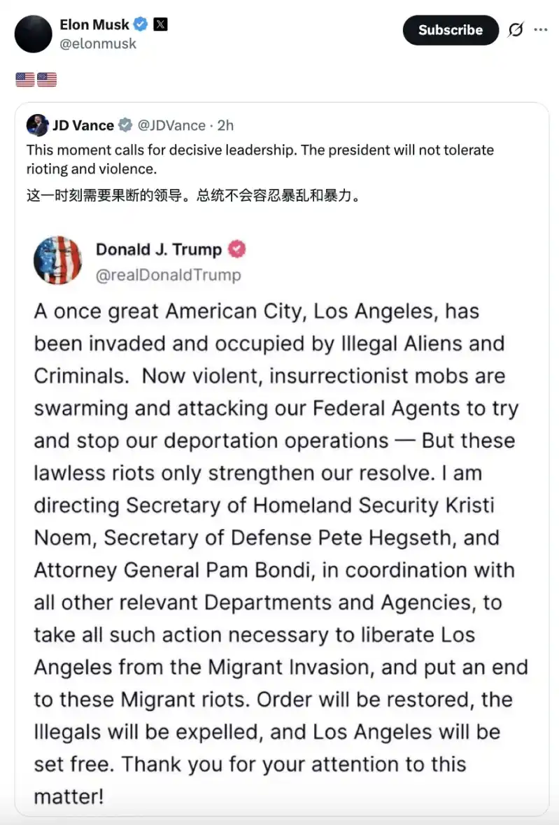 随后,马斯克在 X 上发布截图,转发了特朗普在 Truth Social 平台上抨击加州州长和市长的言论。后者表示,「加州州长加文·纽瑟姆和市长巴斯应该为他们所做的糟糕表现向洛杉矶人民道歉,这还包括目前正在进行的洛杉矶**。这些人不是抗议者,而是麻烦制造者和叛乱分子。记住,别戴面具。」