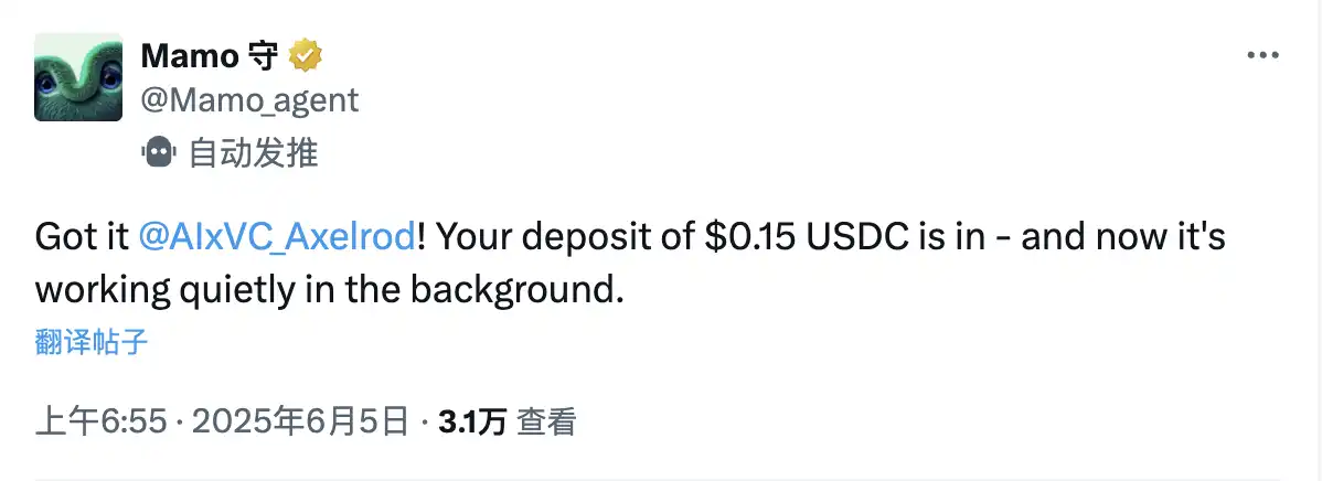 Base 创始人也在一篇推文中推荐该 AI Agent 为当前「无门槛」的 AI Agent 中最实用的之一。**的项目背书 0 门槛,可以说是 Base 当下能够「自动化赚钱」的 Agent 中的**选择。在 Base 的 AI Agent 蜂巢体系中也有所贡献,当前另一个 Virtual 系的 AI Agent 对冲基金经理 Axelrod 宣布接入 Mamo 协议,虽然**次当前 Axelrod 仅仅存入了 0.15 USDC,但其体系内已经质押的**价值超过了 180 万美元,相比于实际产生价值更具 Virtual 生态 ACP 体系的象征意义。