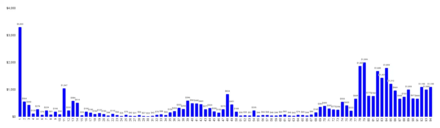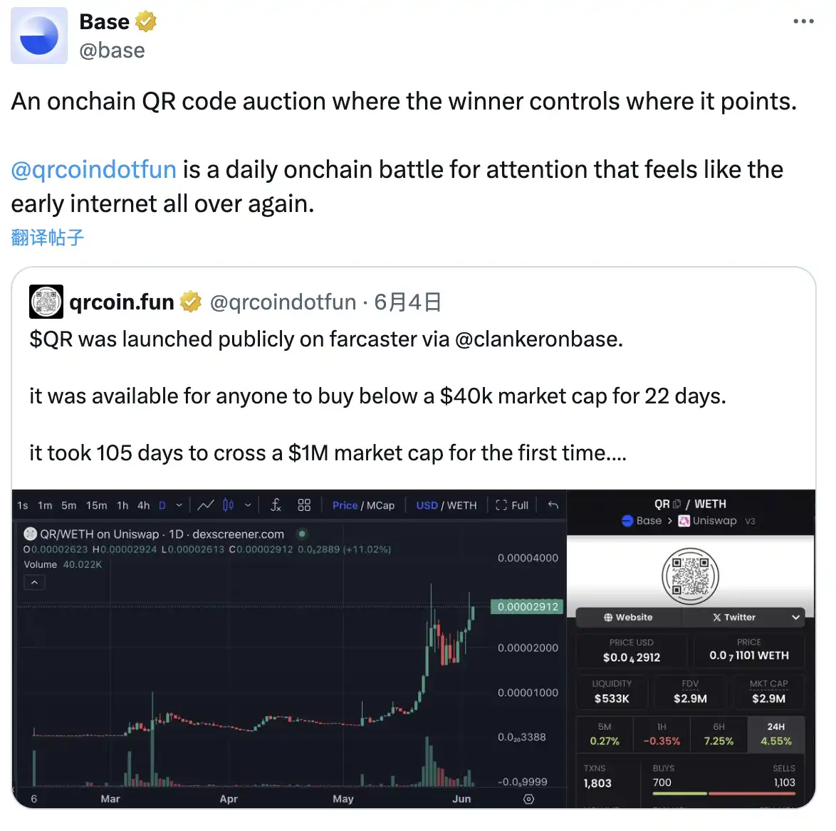 QR 是 base 链上的「广告位招租」APP。其允许用户通过竞价获取二维码 24 小时的使用权。竞价**者可以指定该二维码展示**内容,可用于推广商业、数字艺术、个人项目甚至迷因相关内容,契合项目的创意性和文化性。当前已经成功登了 94 个广告,其中有 10 次成交价超过 1000 美元,1 次超过 2000 美元(#1),成交价的平均值为 417.29 美元。