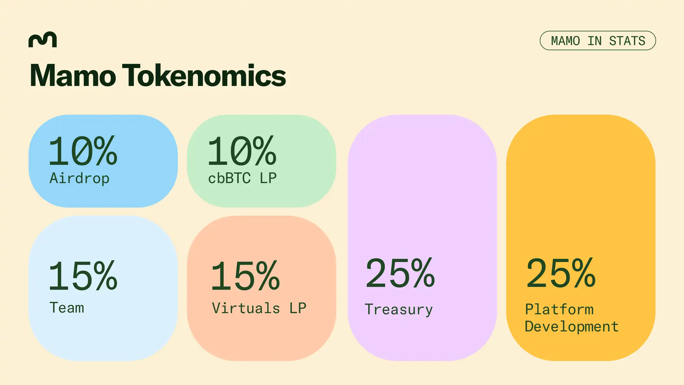$Mamo 当下全流通市值达 9000 万美元,其**分配为 10% 社区空投给 stkWELL 持有者、WELL 持有者、VIRTUAL 质押者、veAERO 持有者,以及 MEME 持有者。25% 的国库储备,分 24 个月线性解锁,25% 的平台开发,同样分 24 个月线性解锁,15% 的 团队分配,6 个月 Cliff,之后部分 24 个月线性解锁,剩下的分别是 15% 的 Virtuals LP 以及 10% 的 cbBTC LP。