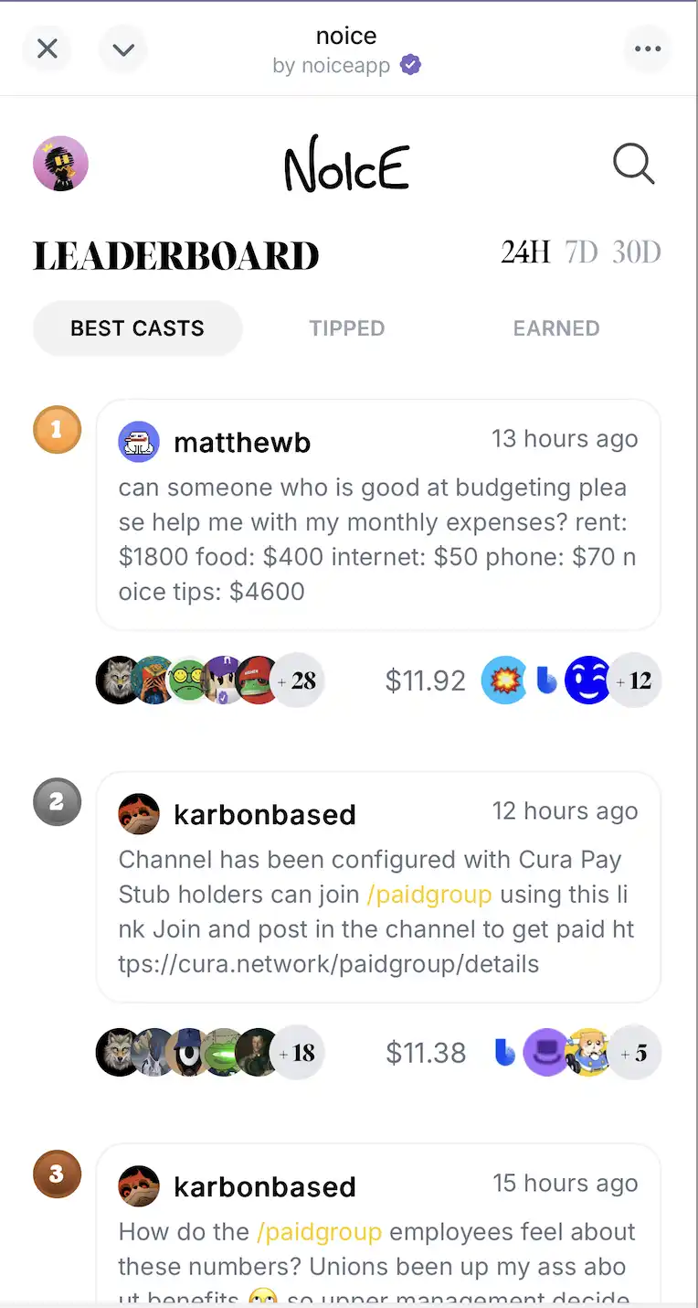 Noice 是一个构建在 Farcaster 生态系统中的社交微支付应用,主打通过点赞、转发、评论等社交互动,实现链上即时小额打赏。它打破了传统 Web3 打赏需跳转第三方应用的繁琐流程,实现了真正的无缝体验。目前 Noice 每日处理超 1 万笔交易,当下已经拥有超过 73 万次「Tip」,是 Farcaster 上交互量**的应用,获得 Base 官方、Jesse Pollak 和 Balaji 等大佬的支持,也赢得了社区广泛关注。