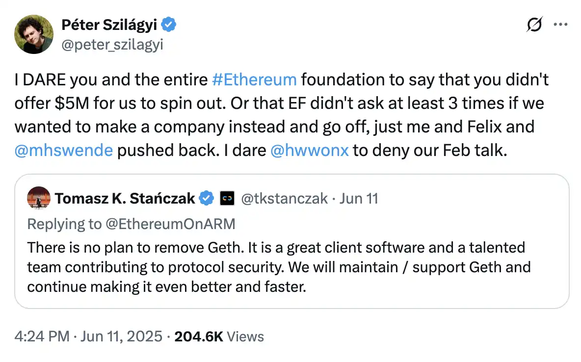 但这一说法显然与 Szilágyi 的披露大相径庭,Szilágyi 更是公开向 EF 领导层发出「敢否认?」的挑战,并点名多位基金会高管曾私下提出让 Geth 团队独立成公司、脱离 EF 的构想,三度被团队拒绝。