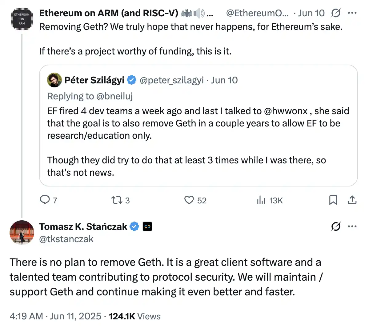面对 Szilágyi 的连番指控,以太坊基金会联合执行董事 Tomasz K. Stańczak 公开回应称:「目前没有**计划要移除 Geth。它是一款出色的客户端软件,也由一支**的团队在为协议安全做出贡献。我们会继续维护和支持 Geth,并致力于让它变得更好、更快。」