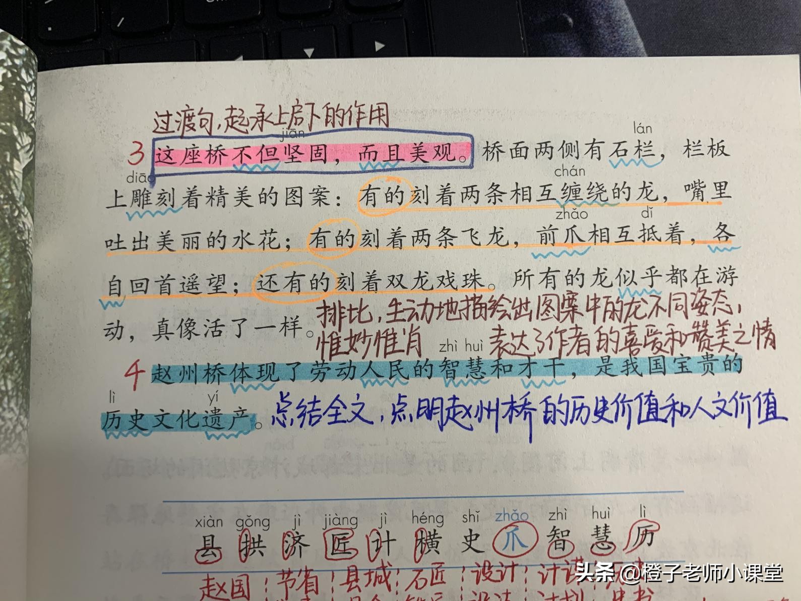 第三段**词是"美观"。介绍赵州桥美观时用"有的……有的……有的……所有的……"的句式,把栏板上龙的图案描绘得栩栩如生,形象传神。