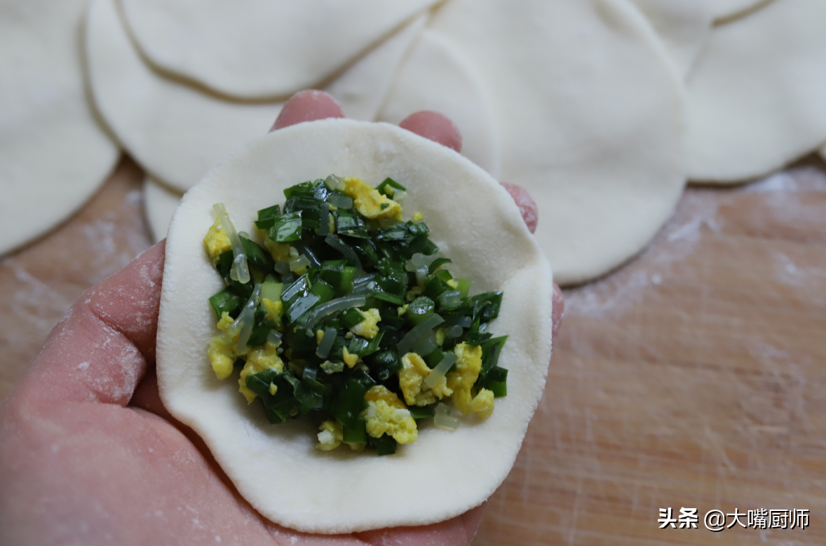 7、把面剂子按扁,擀成中间厚边缘薄的包子皮,包入一大勺韭菜鸡蛋馅,用手捏出褶子,一个包子就包好了,把其它的包子也包好。