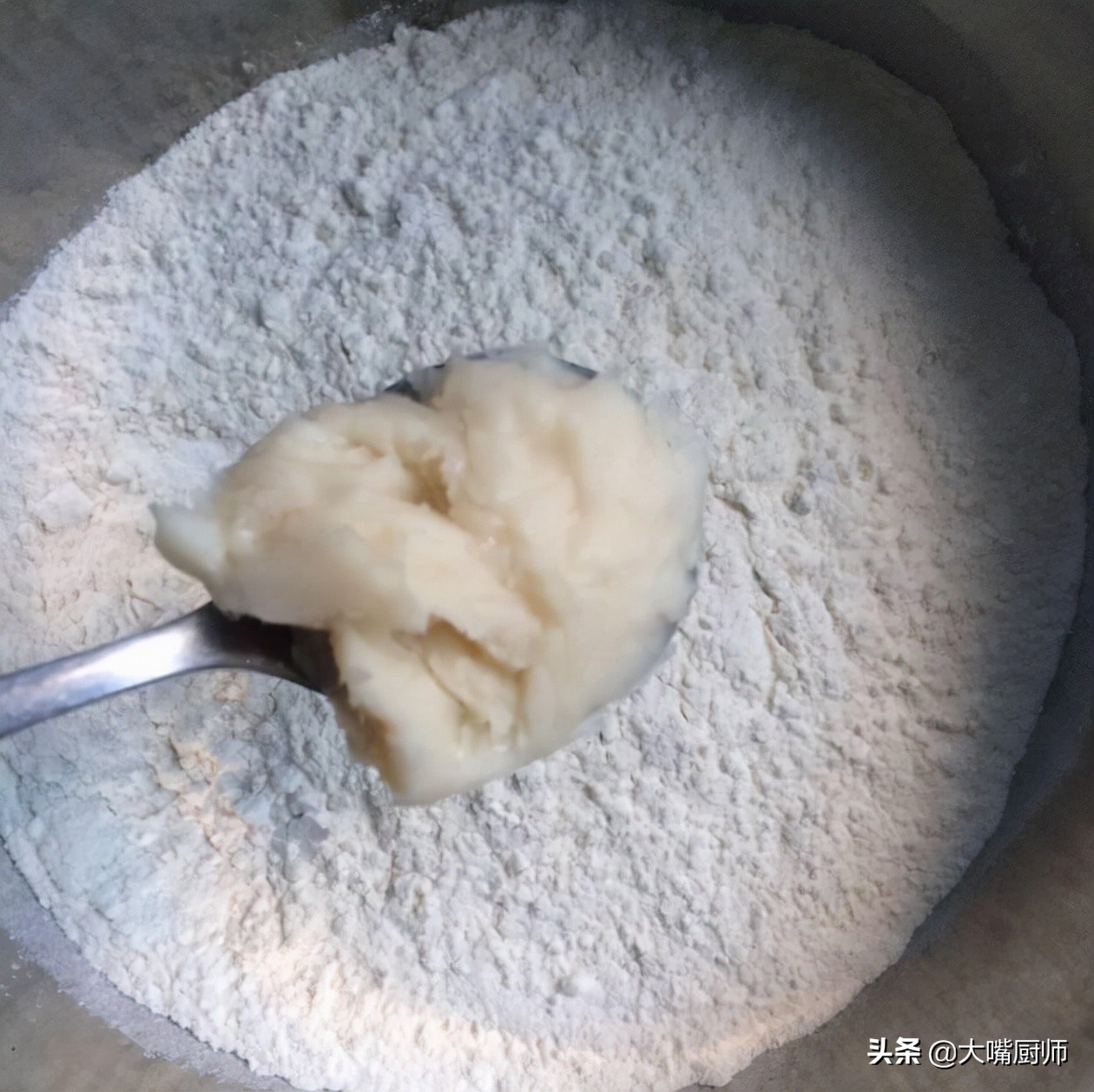 3、加入一勺猪油,不用太多,5克就可以,用手揉几分钟,让面粉和猪油充分混合,这样效果更好。揉成光滑柔软的面团后,盖上保鲜膜,放在温暖的地方发酵1个小时。如果家里比较冷,可以烧一锅40℃的热水,把面粉放进锅里,盖上盖子发酵。