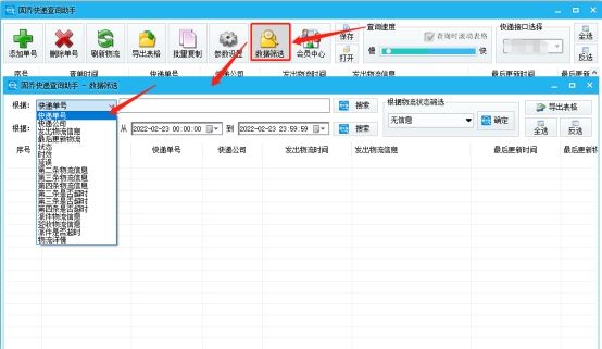 物流信息都查询出来了,我们就来筛选快递单号,点击页面上方的“数据筛选”,就会出现一个窗口,我们选择根据快递单号来筛选。