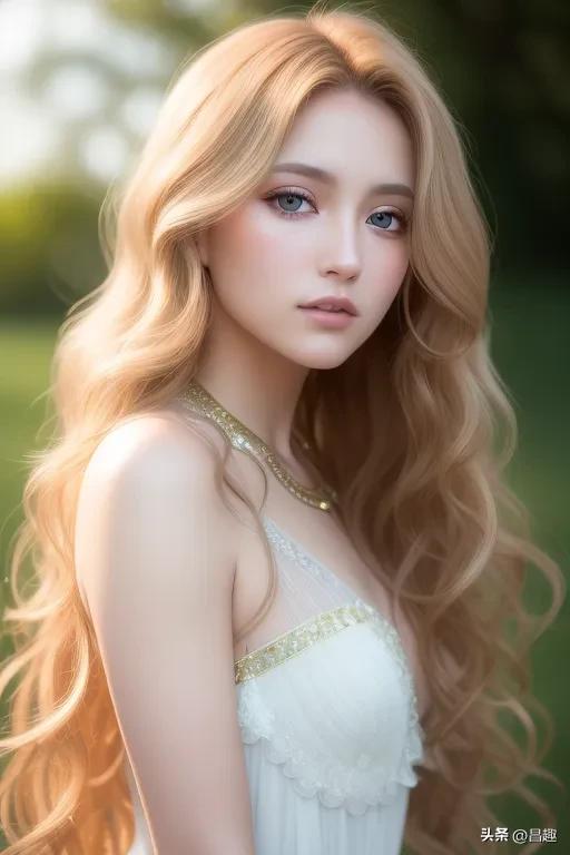 - 金色的卷曲的长发,自然地披散在肩上。
