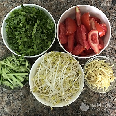 1、番茄切小块,绿豆芽洗净,生菜、黄瓜和生姜分别切丝