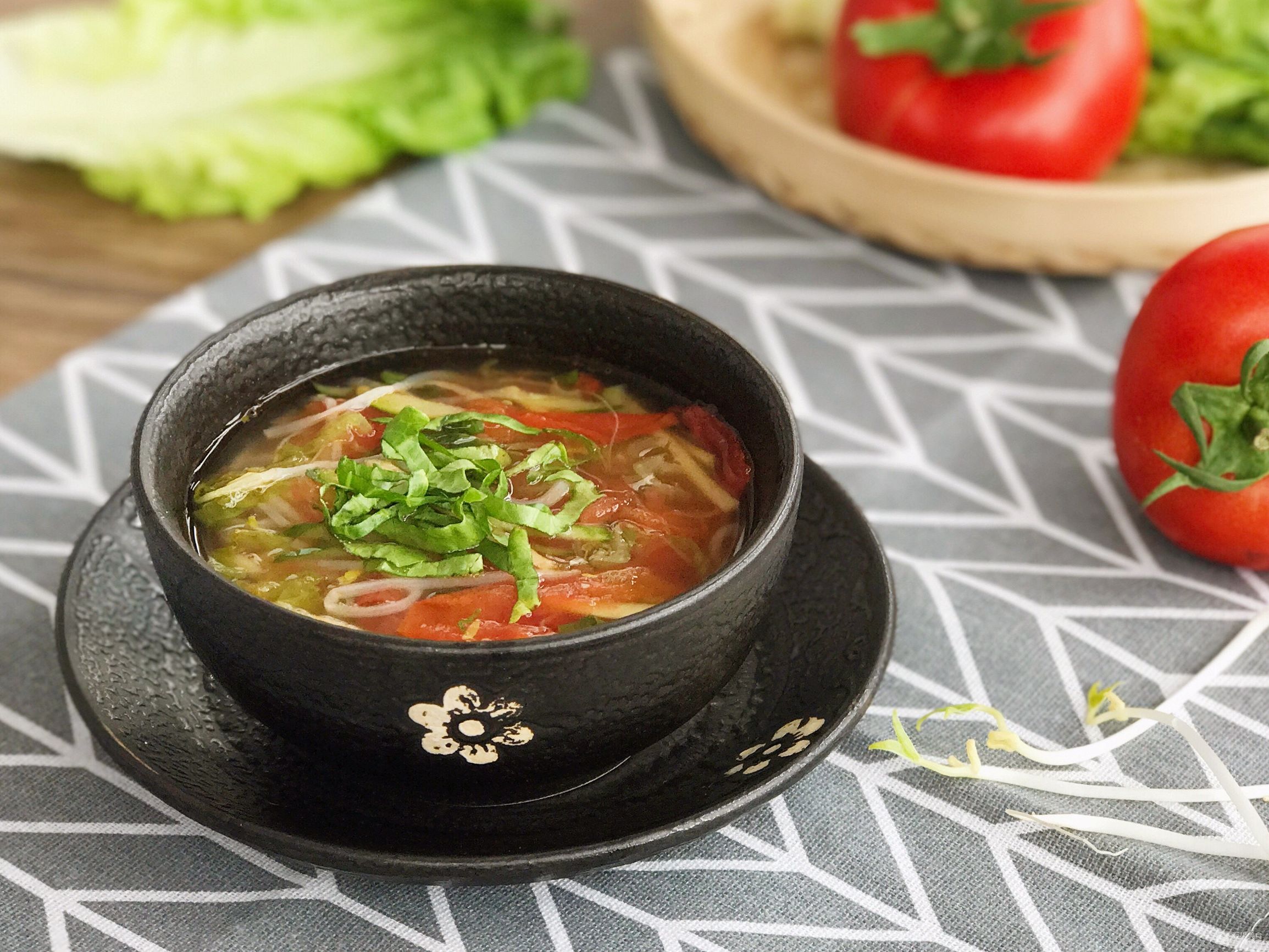 番茄富含有利于人体吸收的抗氧化番茄红素。绿豆芽、黄瓜和生菜则有清胃肠和清热解毒的作用。再配以温中和胃生姜和白胡椒粉,多吃也不觉得寒凉。除了适合素食主义者食用外,还特别适合平时应酬过多、肉食过多和胃肠热毒而上火的人士食用。