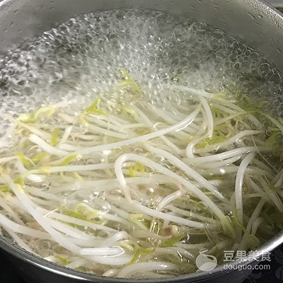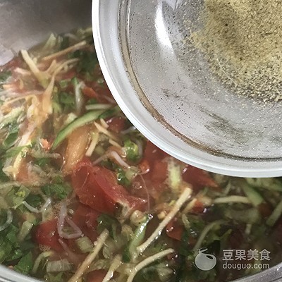 8、把生菜丝、黄瓜丝、绿豆芽和生姜丝加入番茄酱中,大火煮开后关火,再加入食盐和白胡椒粉