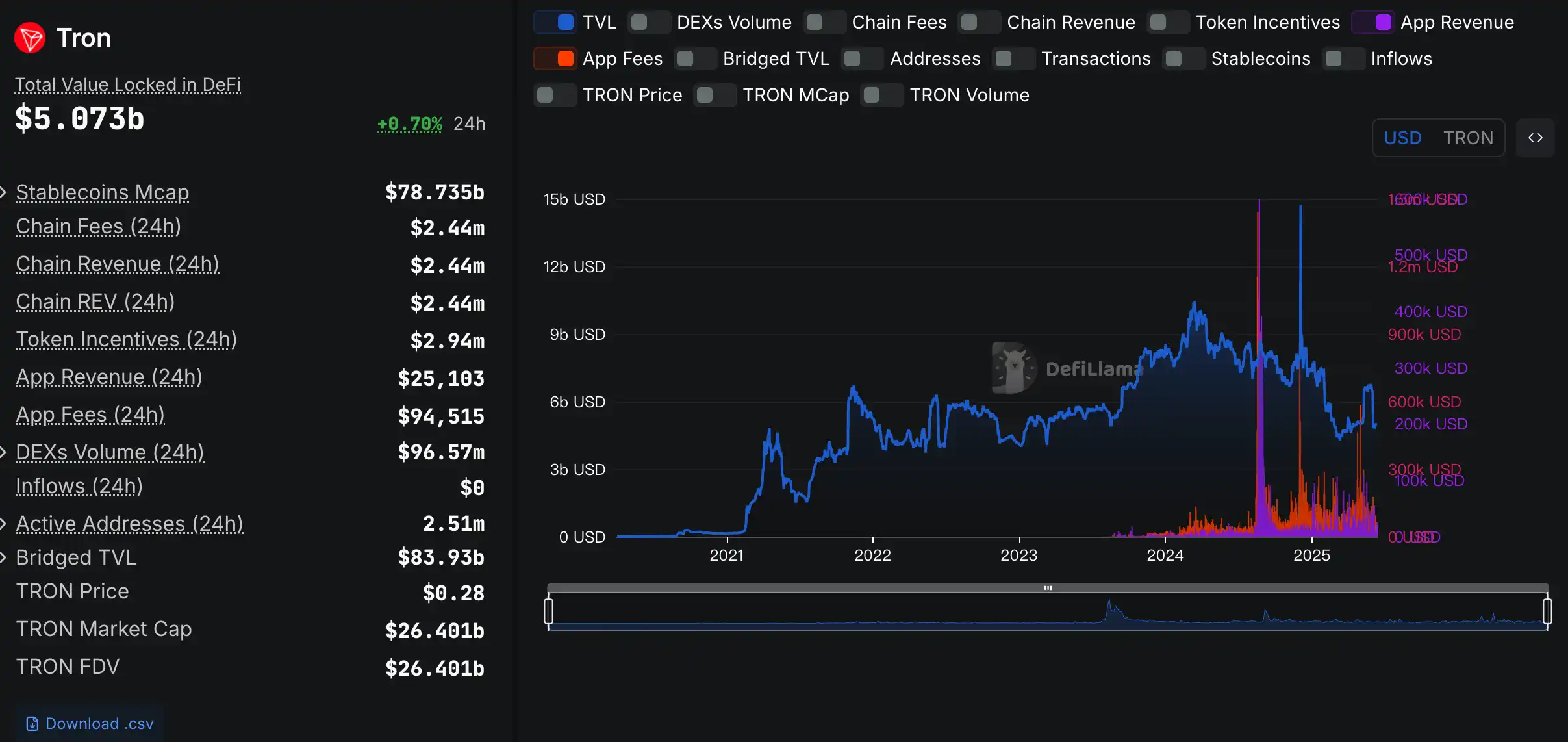 每一笔 USDT 的链上转账,用户支付的手续费通常在 0.3 到 8 美元之间。以更直观的数据来看,波场网络目前每天的链上收入超过 210 万美元,折算成年化收入高达 7.7 亿美元。这其中的绝大部分,都源自于 USDT 的高频转账手续费。波场** 24 小时内的链上交易次数高达 246 万笔,平均下来每笔交易的手续费约为 0.85 美元,和 USDT 的链上平均费率基本吻合。目前,波场整体市值已经超过 250 亿美元,其稳定的链上收入规模长期位居各大公链前列。
