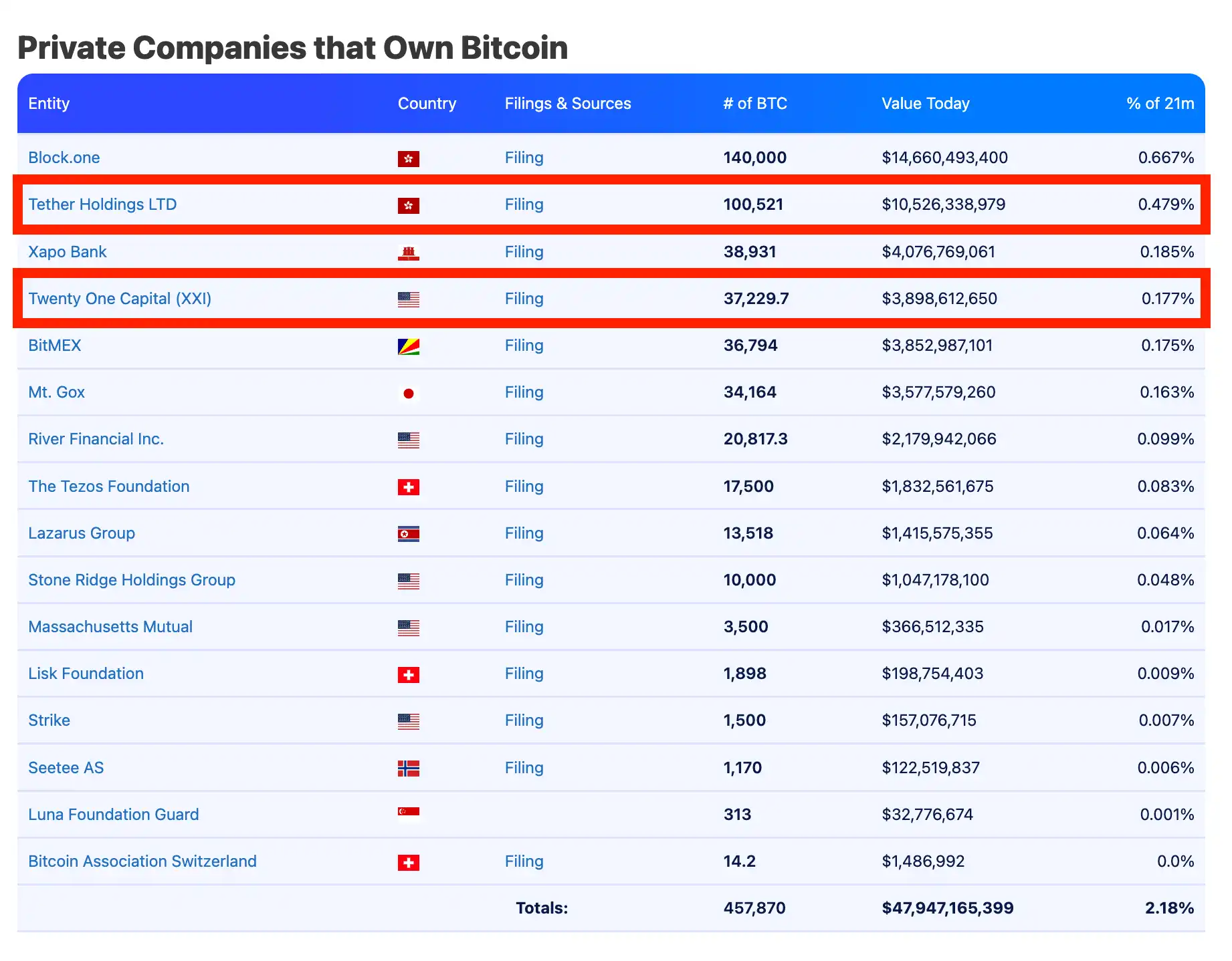 2025 年春天,Tether 宣布将成为 Twenty One Capital 的大股东,该公司通过收购合并在纳斯达克上市,是一家类似微策略的比特币财务公司。