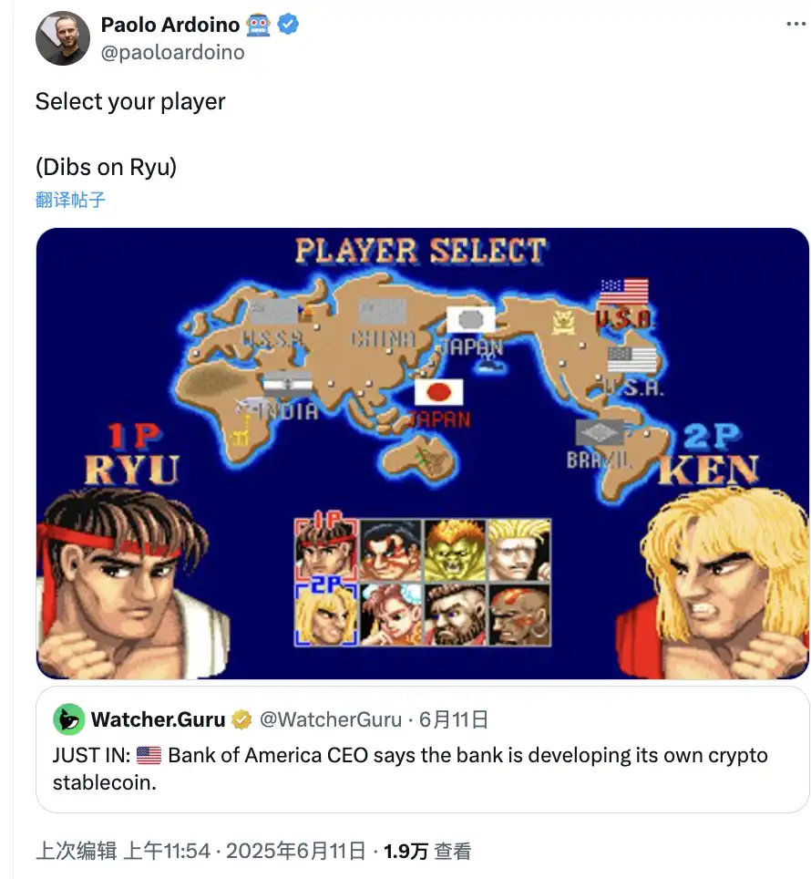 上周,Paolo 把美国**家明确表态愿意发行稳定币的大银行新闻转发到 X,并配了句意味深长的「Select your player」。业内立刻猜测,Tether 很可能与在这家银行合作。